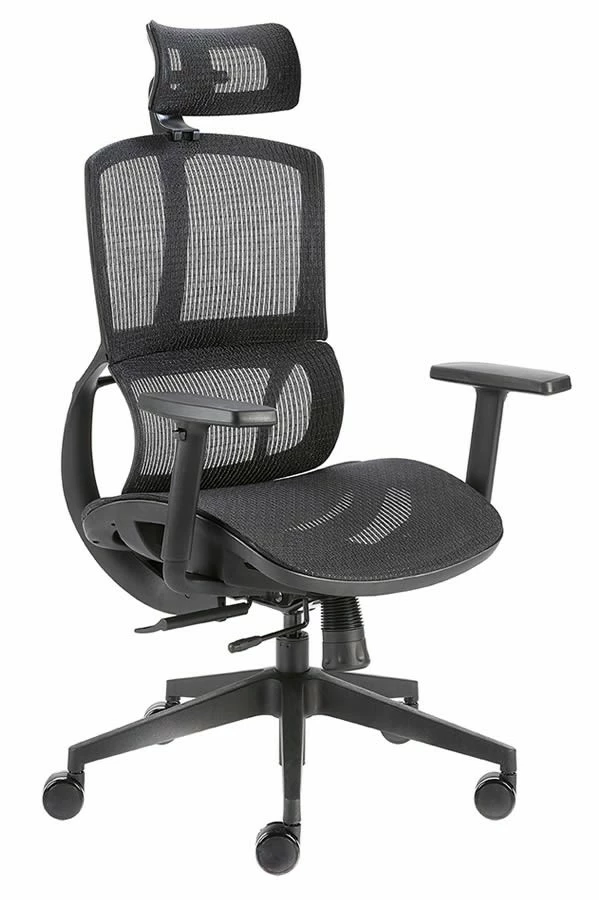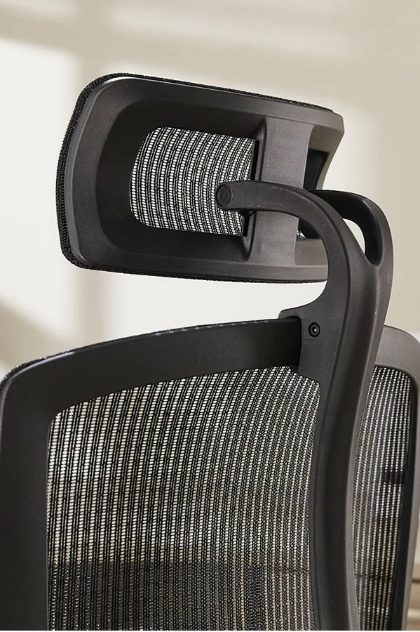 The ergonomically designed high-back executive office chair has a pivot adjustable headrest that is manufactured in a breathable mesh fabric and provides full-body support.