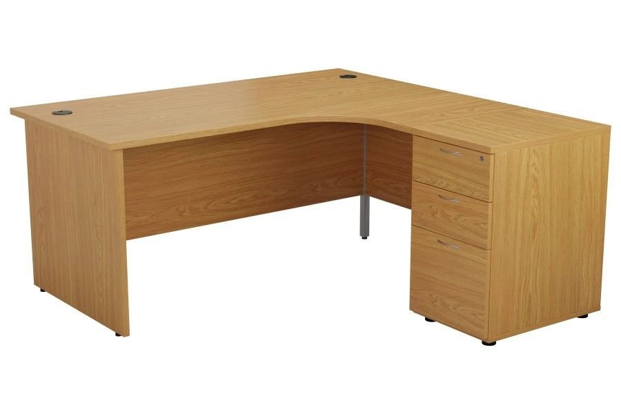 Whether you prefer beech or oak, the Kestral desk gives you the option to choose the colour and shape that suits you best. You can opt for either a left or right crescent and enjoy two internal cable ports for a tidy and organized work space. The panel legs on either end provide stability and support. The worktop is scratch-resistant and 25mm thick.