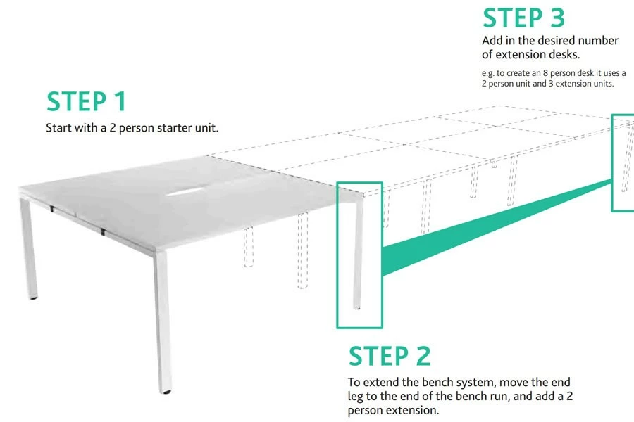 The Kestral Bench Desk Range has a concealed leg format that enables two people to use one desk if necessary without the leg being in the way. This also allows for under desk storage without any interference from the legs.