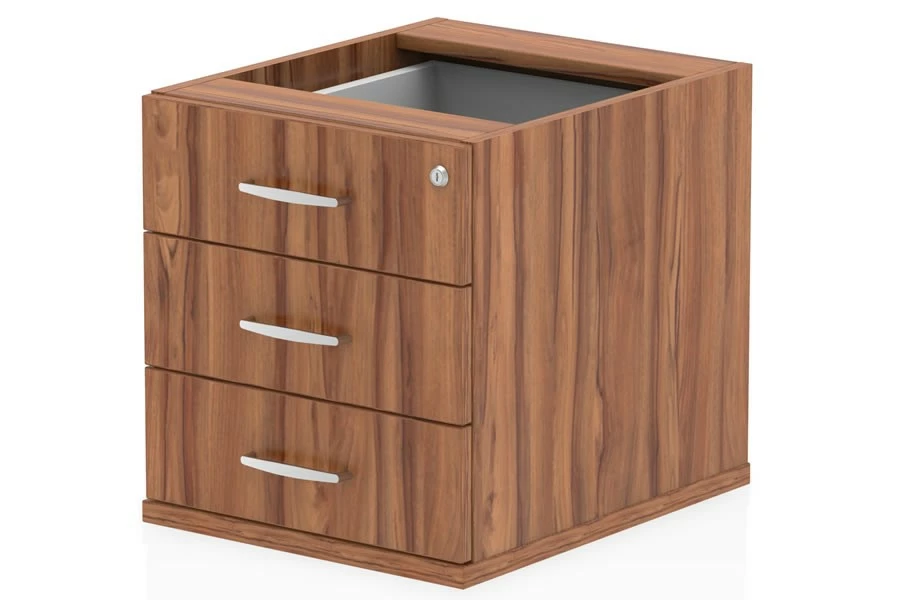 Keep your items safe and organized with the Nova Walnut Fixed Pedestal. This pedestal is a lockable unit that comes in a two or three drawer option. You can choose the one that suits your needs. It has a solid box drawer construction that can hold either foolscap or A4 suspension files. The pedestal comes with two keys, so you can lock and unlock all drawers with one key. The drawers have metal runners and handles that make them easy to use. The pedestal is also sturdy and stylish. It’s made of durable MFC board that is easy to clean and has a professional look. The Nova Walnut Fixed Pedestal is the ideal storage companion for your Nova Walnut desk.