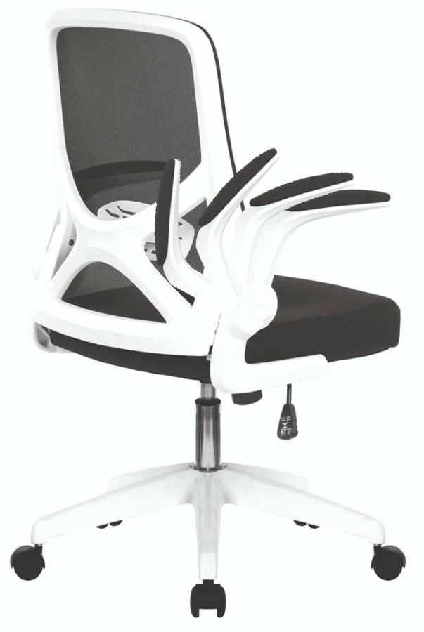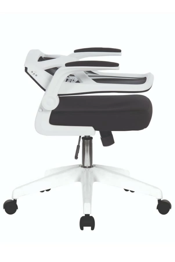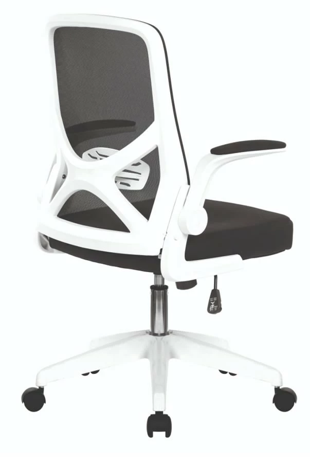 The chair features fixed lumbar support, a generously padded seatpad, complementing mesh back upholstery and a striking white back shell and frame with matching white nylon base with castors.