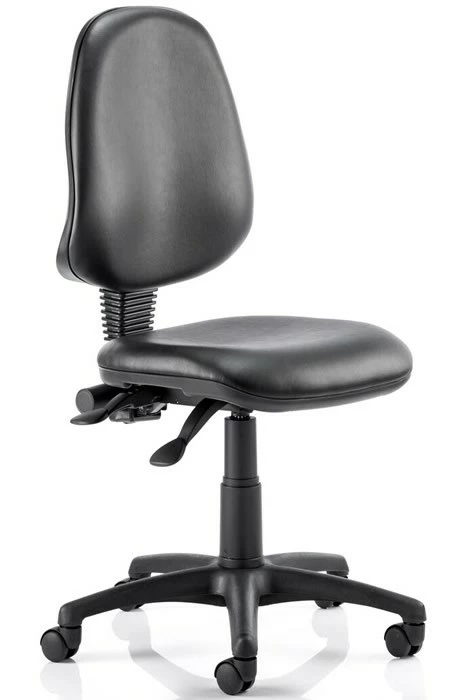 The Vinyl Operator Chair High Back Task Chair features a 2 lever adjustable mechanism and a sculptured lumbar and spine support to increase comfort. Easily wiped clean to reduce germs.