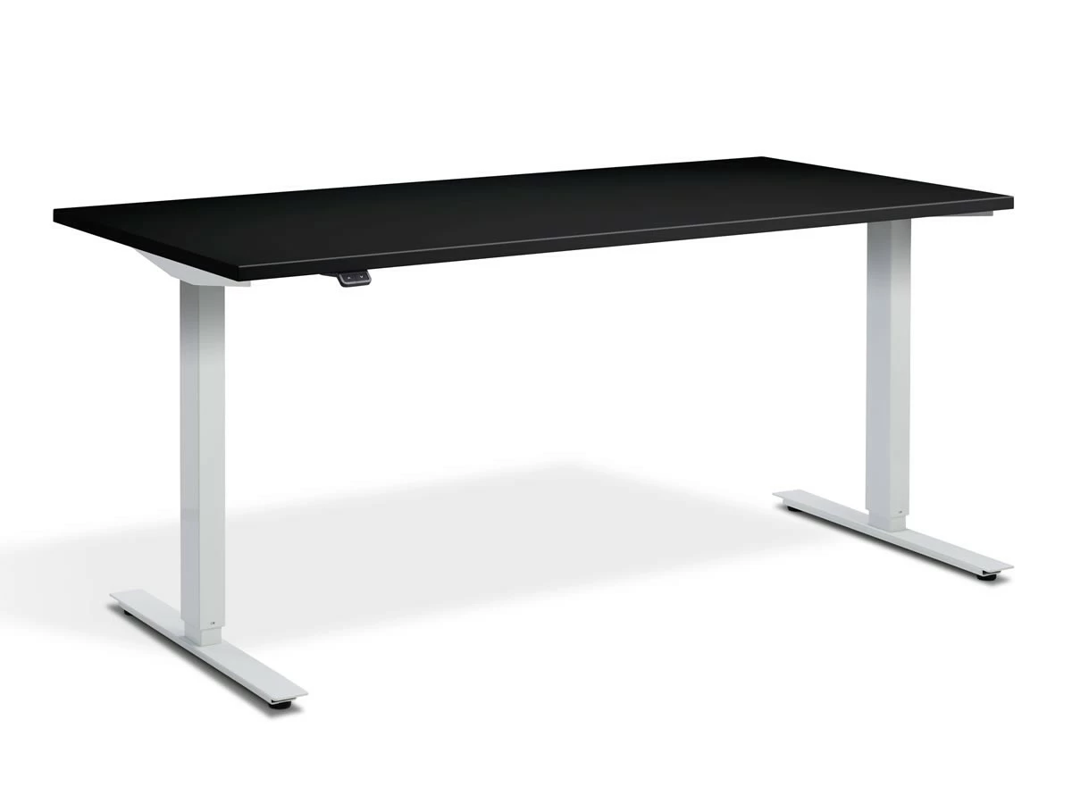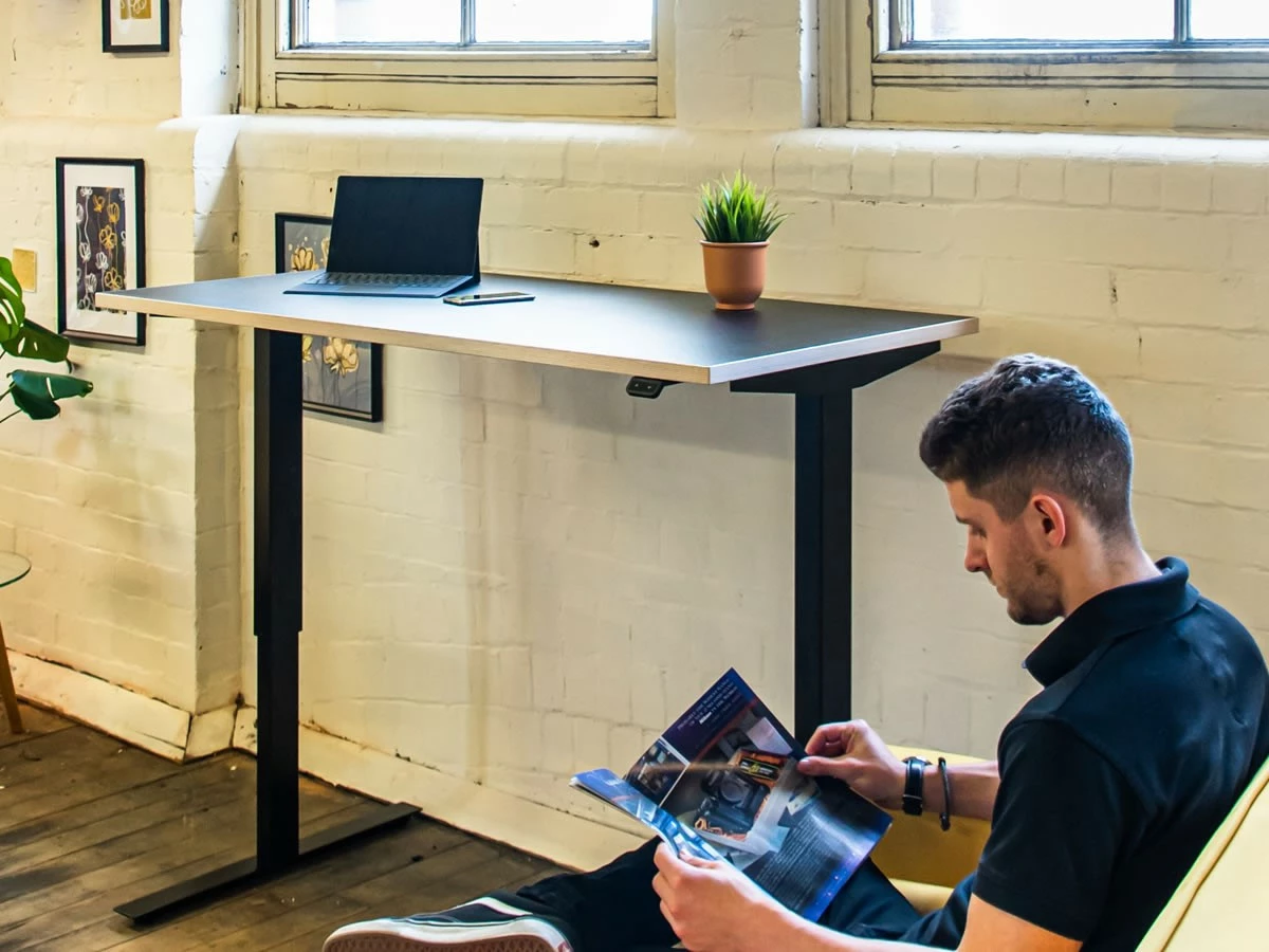 Available in Silver, white or black powder coated height adjustable frame finishes, and 8 different desk top finishes in a choice of two top sizes – Tops are able to be fitted either left or right-handed depending on personal choice so you can get the exact colour combination and size to blend in seamlessly to any office!